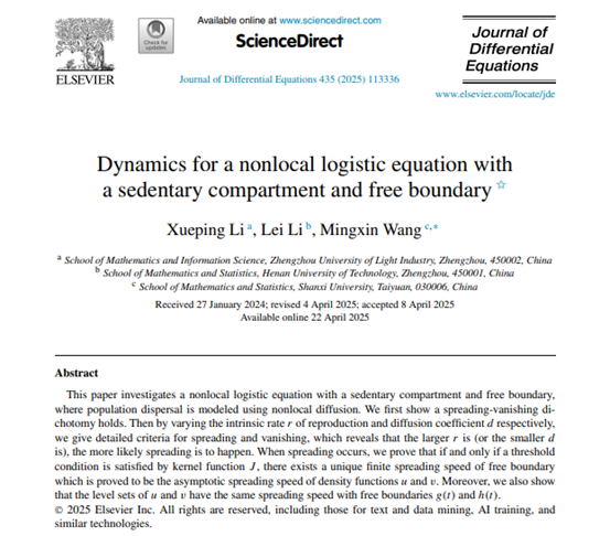 Recently, Dr. Li Xueping from the School of Mathematics and Information Science published a research paper titled Dynamics for a Nonlocal Logistic Equation with a Sedentary Compartment and Free Boundary in the internationally renowned Journal of Differential Equations (CAS Zone 1, TOP journal). Zhengzhou University of Light Industry is listed as the first authoraffiliation, with Dr. Li Xueping as the first author. The work was conducted in collaboration with Dr. Li Lei from Henan University of Technology and Professor Wang Mingxin from Shanxi University.