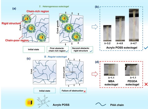 To address the critical issue of crack propagation that tends to occur in gel-based soft matters under large deformations, a POSS-basedcompositegel materialcontaining a heterogeneous polymer network was innovatively designed and prepared. This material demonstrated exceptional resistance to crack propagation, with low hysteresis, strong adhesion, andsuperior antifreeze properties (adaptable toa temperature as low as -40°C). The flexible sensors based on this gel exhibited stable strain responses within a wide temperature range, providing an innovativestrategy for developing defect-tolerant and extreme-environment-resistant flexible sensordevices.