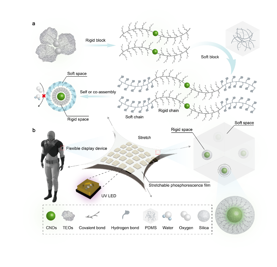 Dr. Liang Yachuan prepared a series of multicolor stretchable phosphorescent materials by embedding rigid microphases into a flexible PDMS matrix. This unique interaction mechanism enhances the overall flexibility and stretchability of the material, achieving a maximum elongation of up to 97%. Ultimately, multifunctional applications based on these composite materials were successfully demonstrated, with particular emphasis on flexible display devices that exhibit excellent stretchability and mechanical adaptability. This work not only ingeniously combines the rigidity and flexibility of carbon dot-based phosphorescent films, effectively addressing the long-standing "rigid-soft integration" challenge in traditional material design, but also broadens the applications of RTP materials in optical displays. This research, titled "Phosphorescent Elastomer through Carbon Nanodots Microphase Engineering for Diverse Applications," was published in Nano Letters (Impact Factor 9.6), a top-tier journal in materials physics. Dr. Liang Yachuan currently leads one National Natural Science Foundation of China Youth Project and one Henan Province Outstanding Youth Foundation Project.