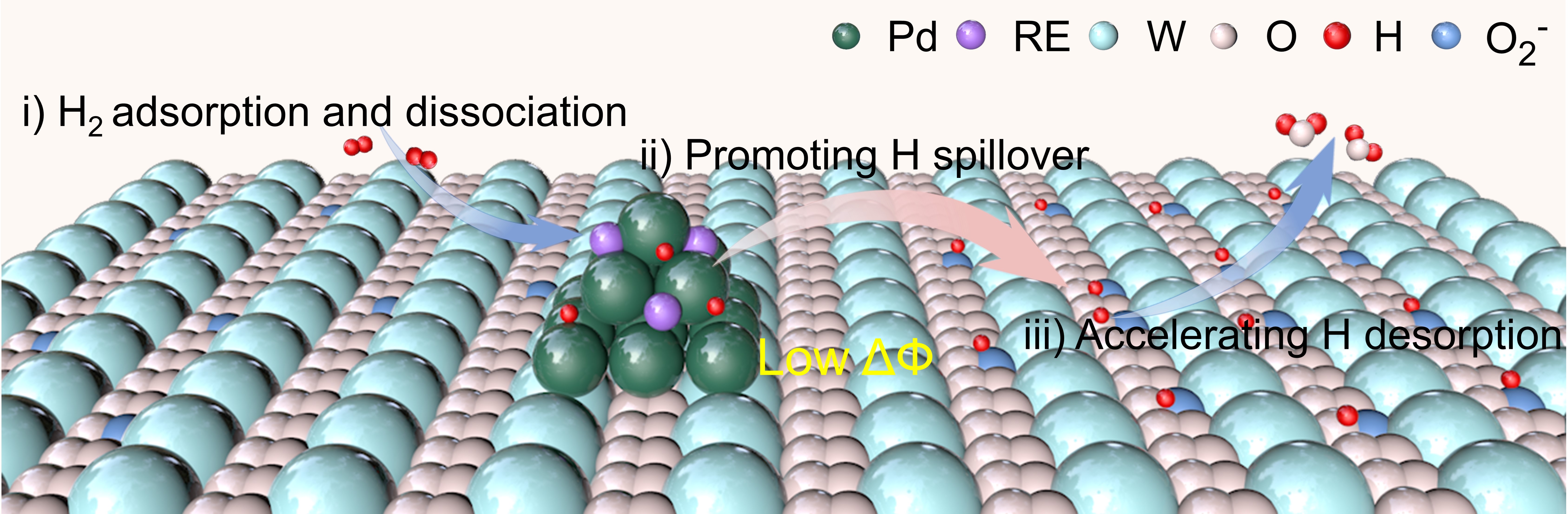 As a clean and efficient energy carrier, hydrogen plays a crucial role in helping achieve the "dual carbon" goals. The high explosiveness of hydrogen poses severe challenges for its safe monitoring. Addressing the issues of low sensitivity and slow response of semiconductor gas sensors under room temperature conditions, the team precisely regulated the work function difference between Pd nanoparticles and WO₃ support, as well as the oxygen vacancy concentration in the support, using rare earth single atoms. This efficiently optimized the migration and desorption process of hydrogen from Pd to WO₃, achieving high-efficiency detection of trace hydrogen at near room temperature. Theoretical calculations show that the work function difference and oxygen vacancy formation energy increase with the number of 4f orbital electrons. The Ce-Pd/WO₃ sensor, which has the lowest work function difference and oxygen vacancy formation energy, exhibits the lowest hydrogen migration and desorption energy barriers. The gas sensor fabricated from Ce-Pd/WO₃ demonstrates a response value as high as 31.3 to 50 ppm hydrogen at 40 °C, with a detection limit as low as 113 ppb, and response and recovery times of only 3 seconds and 15 seconds, respectively, far exceeding currently reported hydrogen sensing performance. Furthermore, this gas sensor was successfully applied to real-time safety monitoring of trace hydrogen leakage (0.1 v/v%) from aluminum-air batteries.