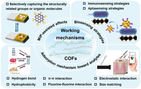Food safety is critical for both public health and sustainable economic development. Typically, there is a wide spectrum of potential contaminants related to food safety, including antibiotics, pesticides, heavy metal ions, mycotoxins, organic pollutants, and foodborne bacteria. In light of this, the development of advanced detection technologies for the precise and sensitive identification of such contaminants in food and the environment holds paramount importance. This review summarizes recent progress and current situation of covalent organic frameworks (COFs) in detecting food contaminants in complex environmental and food matrices. It elaborates on the structural features and classification of COF-based nanomaterials, and clarifies the relationship between the structural design of COFs and their sensing performance. Additionally, the adsorption mechanisms and biosensing principles of COF-based sensors for detecting food contaminants are discussed, along with a summary of various detection techniques. Finally, the review not only identifies the challenges and future prospects for food contaminant detection technologies, but also provides a clear path for researchers to transform molecular design into practical applications. These research efforts will inject fresh impetus into the development of next-generation precision-targeted COF-based sensors and the enhancement of food safety monitoring.