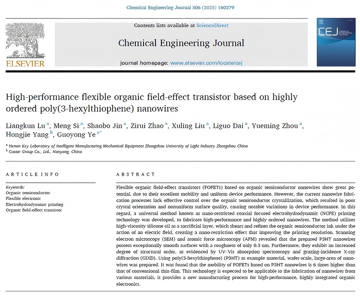 Recently, the research team led by Professor Ye Guoyong from the College of Mechanical and Electrical Engineering, concentrating on the research into micro-nano electrofluid jet printing technology and its applications, published a research paper titled "High-performance flexible organic field-effect transistor based on highly ordered poly (3-hexylthiophene) nanowires" in the Chemical Engineering Journal (Chinese Academy of Sciences Q1 TOP journal, IF = 13.4), an international top-tier journal. Additionally, the team received the "Best Researcher Award" granted by SCIENCEFATHER, a global academic organization. Dr. Lu Liangkun, a young teacher from the College of Mechanical and Electrical Engineering, serves as the first author, and Professor Ye Guoyong serves as the corresponding author. Zhengzhou University of Light Industry is credited as the first affiliated institution for this work.